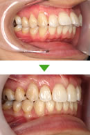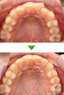 患者の症状:上下顎共に叢生。 治療方法:マウスピース型矯正装置により、側方拡大・IPRを行い矯正を行う。 治療結果:歯を抜く事なく矯正治療を行えた。 |