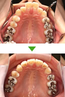 患者の症状:上下顎共に叢生。 治療方法:マウスピース型矯正装置により、側方拡大・IPRを行い矯正を行う。 治療結果:歯を抜く事なく矯正治療を行えた。 |