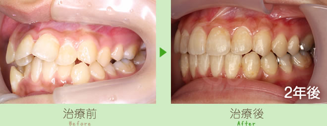 CASE1インビザライン:上顎前突の治療前と2年後の症例をご覧いただけます。